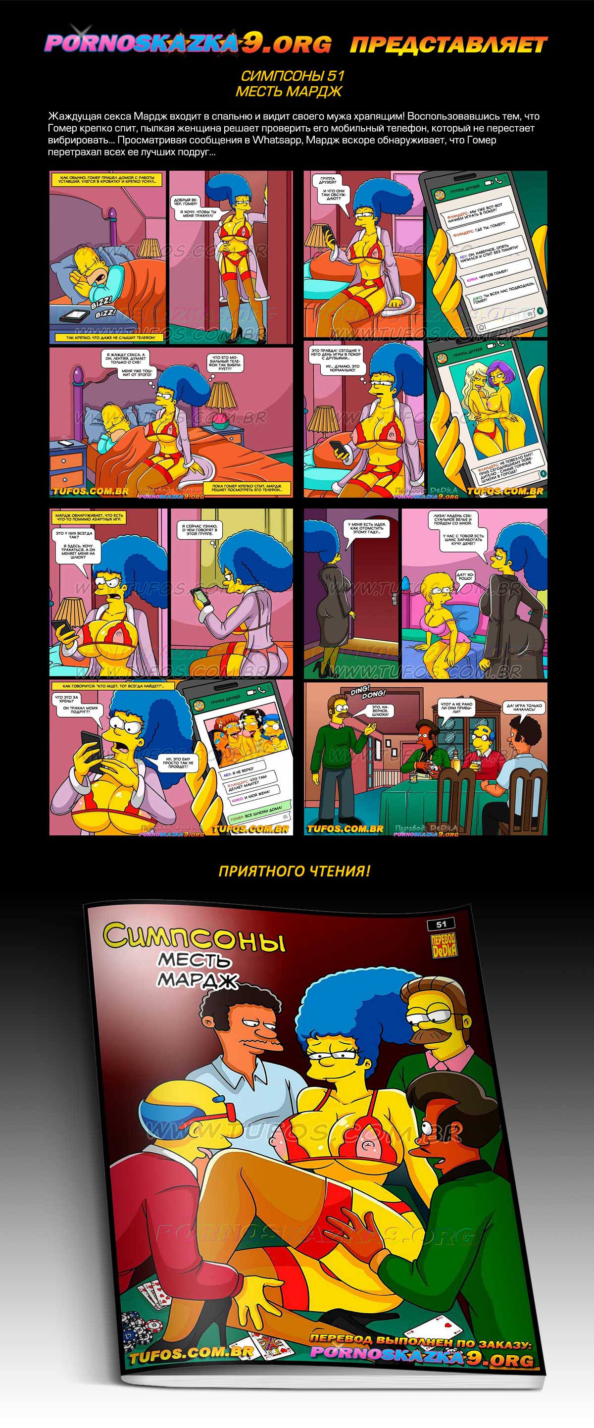 Порно комикс «Симпсоны. Часть 51. Месть Мардж.» Жаждущая секса Мардж входит в спальню и видит своего мужа храпящим! Воспользовавшись тем, что Гомер крепко спит, пылкая женщина решает проверить его мобильный телефон, который не перестает вибрировать… Просматривая сообщения в Whatsapp, Мардж вскоре обнаруживает, что Гомер перетрахал всех ее лучших подруг…